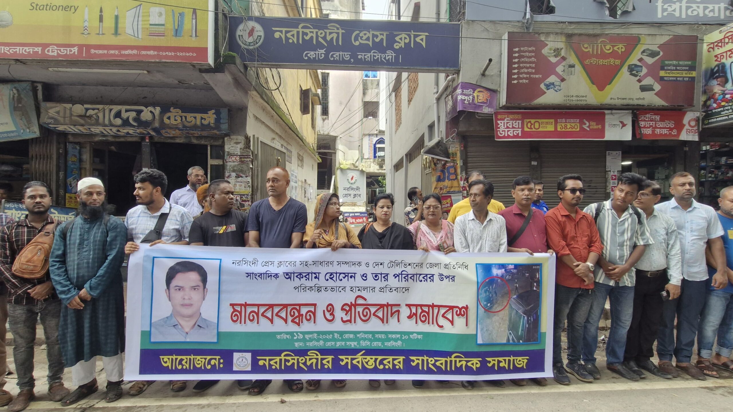নরসিংদীতে সাংবাদিকের উপর হামলার বিচারের দাবিতে মানববন্ধন ও প্রতিবাদ সভা