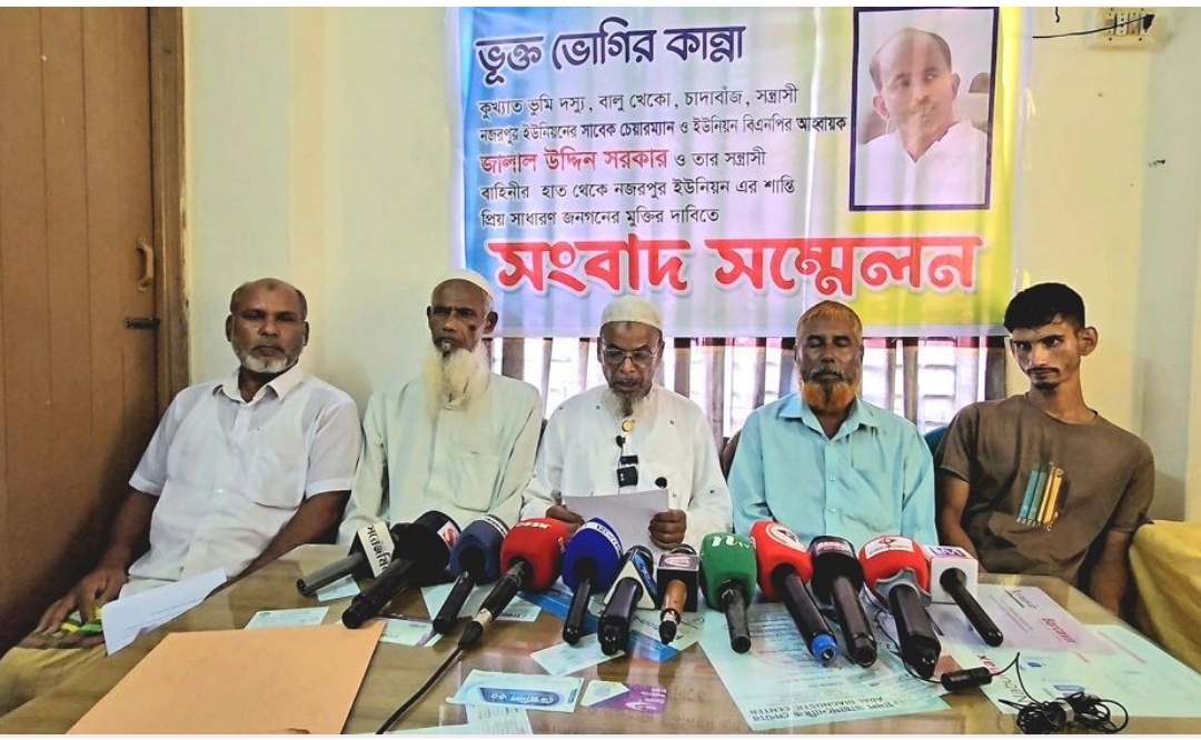 সংবাদ সম্মেলনে উপস্থিত অন্যান্য ভুক্তভোগী ও এলাকাবাসী অভিযোগ করেন, জালাল উদ্দিন স্থানীয় আওয়ামী লীগ নেতাদের সম্পদ পাহারা দিয়ে তাদের আশ্রয় দিচ্ছেন এবং নজরপুর এলাকায় টাকার বিনিময়ে রাজনৈতিক পুনর্বাসনের কাজ করছেন। তারা জালাল উদ্দিন সরকারের হাত থেকে মুক্তি এবং এলাকায় নিরাপদে বসবাসের দাবি জানান।