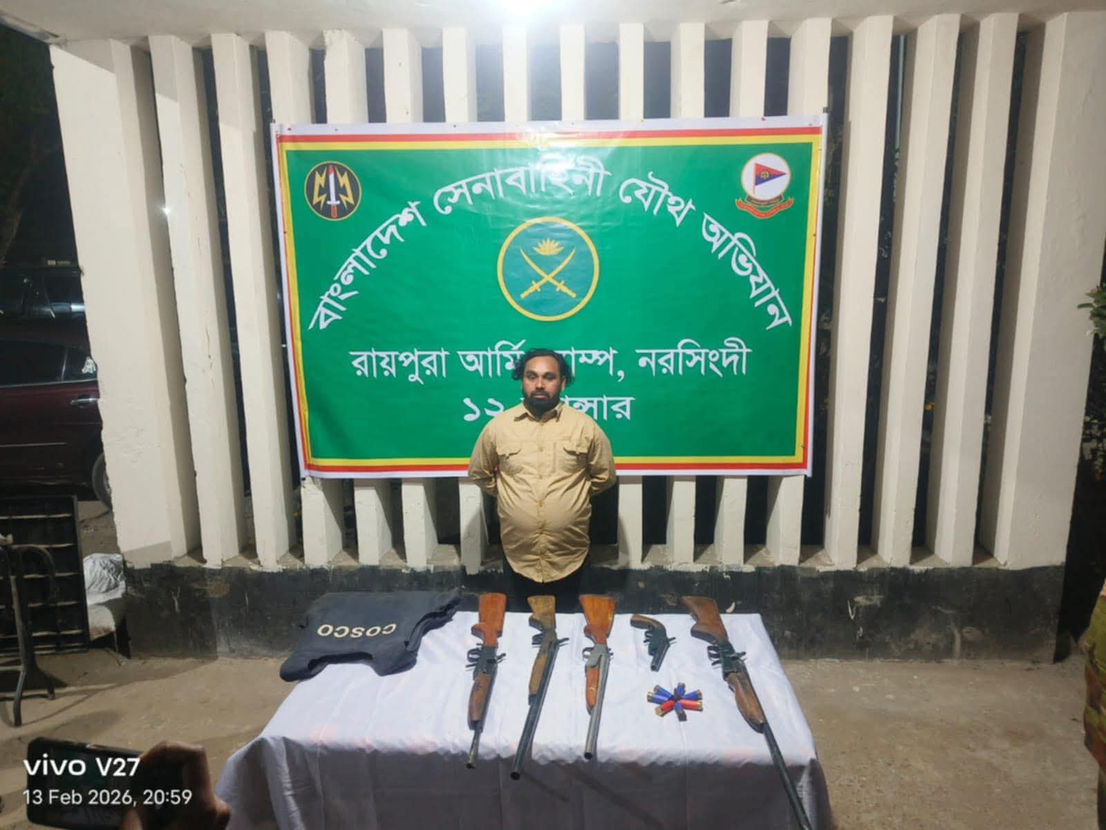 নরসিংদীর জেলার রায়পুরা উপজেলার দুর্গম চরাঞ্চলে যৌথবাহিনীর অভিযানে বিপুল পরিমাণ আগ্নেয়াস্ত্র, গুলিসহ একজনকে আটক করা হয়েছে।