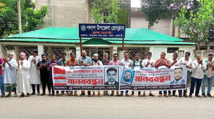 গাজীপুরে সাংবাদিক আসাদুজ্জামান তুহিনকে নৃশংসভাবে কুপিয়ে হত্যার প্রতিবাদে এবং দোষীদের দ্রুত বিচারের দাবিতে নরসিংদীর পলাশে মানববন্ধন করেছে কর্মরত সাংবাদিকরা। শনিবার (৯ আগস্ট) সকালে পলাশ উপজেলা প্রেস ক্লাবের সামনে অনুষ্ঠিত এই